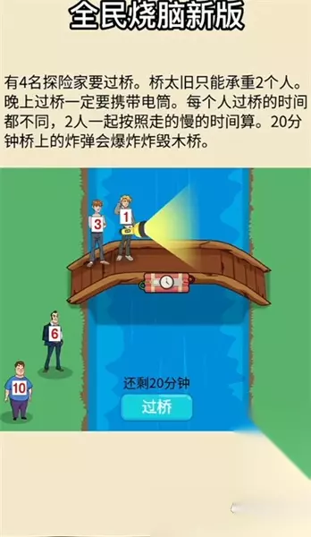 关卡解答: B带着70金币过河,B回到起点,C带着30金币过河,C回到起点,AB一起过河,A带着30金币回到河对岸 C带着100金币过河,B带着70金币回到河对岸,AB过河,C回到河对岸,C带着30金币过河,B回到河对岸,B带着70金币过河 【第三关】 有4名探险家要过桥,桥太旧只能承重2个人,晚上过桥—定要携带电简,每个人过桥的时间都不同,2人一起按照走的慢的时间算,20分钟桥上的炸弹会爆炸炸毁木桥。