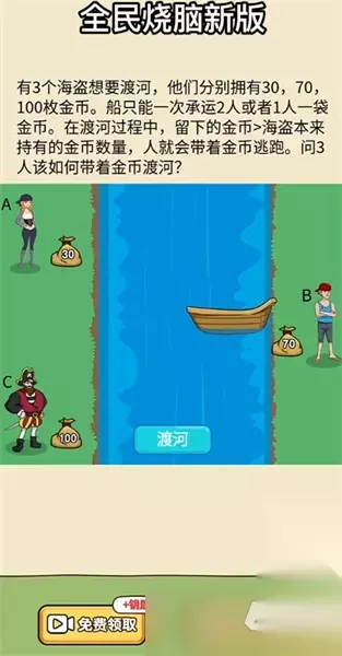 关卡解答: 1.C与D一起过河,C乘船堆到起点 2.B/补给一起乘船过河,D乘船回到起点位置 3.C/D乘船过河,C继续乘船回到起点 4.A乘船抵达对面,D乘船回到起点 5.C/D乘船过河,这就是五次过河方式 【第二关】 有3个海盗想要渡河,他们分别拥有30,70,100校金币 船只能一次承运2人或者l人一袋金币,在渡河过程中,留下的金币>海盗本来持有的金币数量,人就会带着金币逃跑,问3人该如何带若金币渡河?