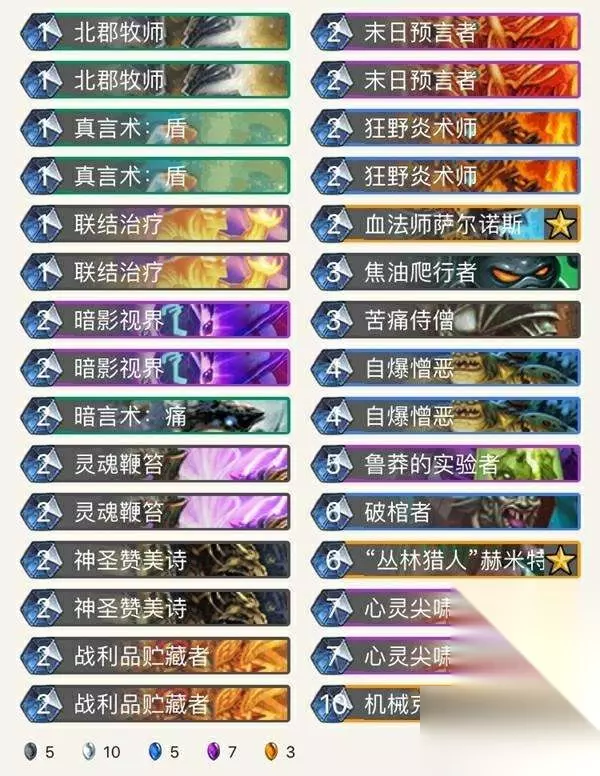 需要的key牌比较多,机械克苏恩+鲁莽实验者+破馆者+两张自爆憎恶。斩杀顺序为:鲁莽实验者-破馆者-两张自爆憎恶,结束回合赢得胜利。顺序是一定不能够错的。这套牌过牌手段比较多过牌能力极强,北郡、苦痛、战利品等以及各种combo都能有效过牌。如果能够6费准时打出赫米特,那对手几乎要gg,就怕术士的恶魔计划。不过总体来说,机械克苏恩牧应该是目前最稳定上分的一套克苏恩卡组了。