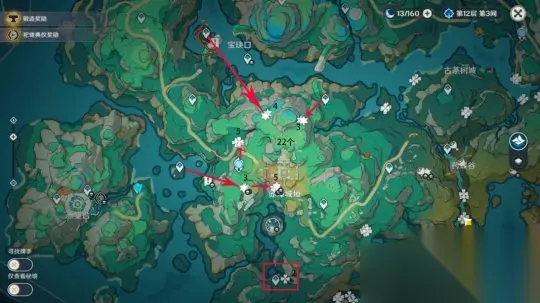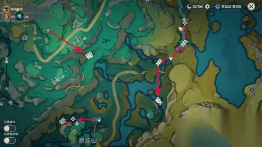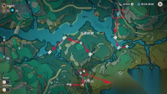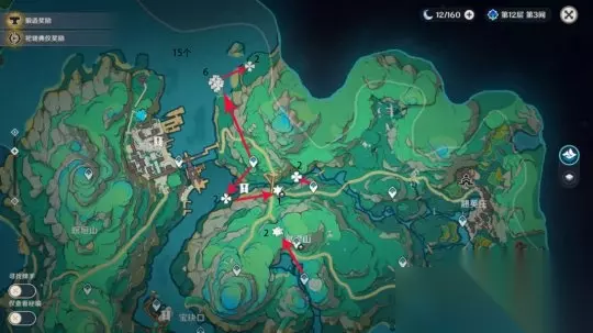 四、清水玉收集路线: ①遗珑埠(bu)灵蒙山; ②古茶树坡、药蝶谷; ③悬练山上方; ④赤璋城垣。 路线图中四瓣花为地表,六角星为地洞,鸡腿则代表一次性不可再生。 路线一:遗珑埠和灵蒙山共能收集15个,1-15清水玉。