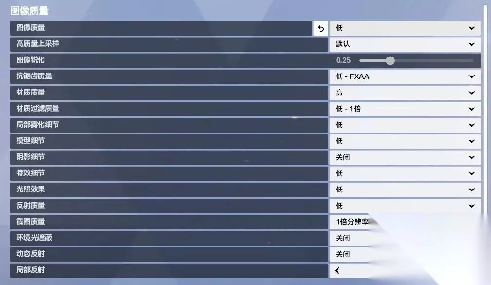 二:图像质量设置(提高帧率) 整体画质:低(保证流畅度) 抗锯齿:FXAA 低(减少锯齿影响) 材质质量:高(对帧率影响较小,可提高画面清晰度) 材质过滤:1x(不过度占用显卡) 阴影细节:关闭(提升帧率) 特效细节:低(减少眼睛疲劳) 光照效果:低(减少额外计算负担) 反射质量:低(避免额外渲染) 环境光遮蔽:关闭(减少计算压力) 动态反射&局部反射:关闭(两者同时关闭)