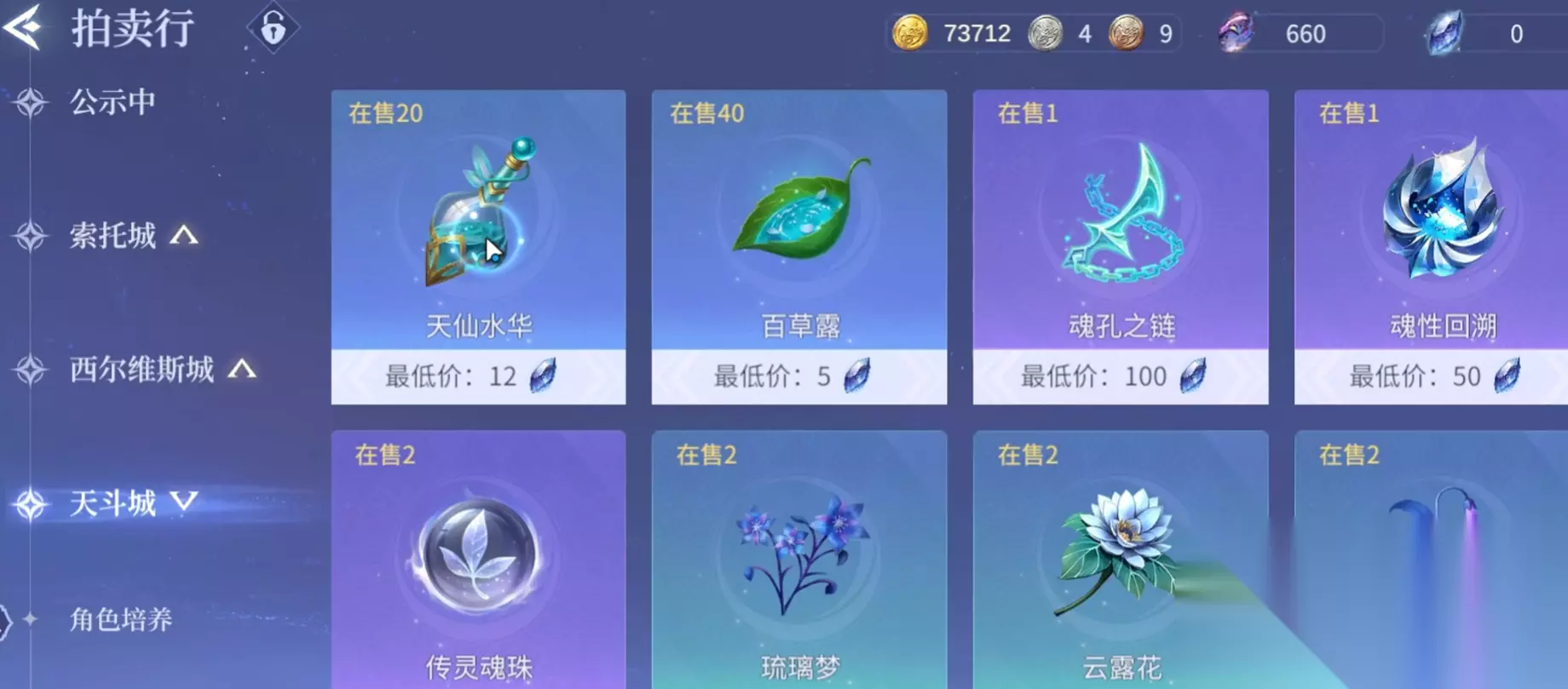 首先是天斗城,该区域不需要跑图,只要做月轩任务就会到达这里,此地必买材料为天仙水华、百草露、魂孔之链、魂性回溯和传灵魂珠,这些都是升级和培养材料,前期比较稀缺,可以大量购入。