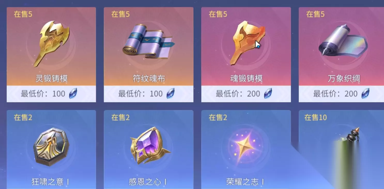 到达星罗城后,对于锻造装备的材料就会比较需要,建议大家购买下图中的上面四个,它们具体的作用是增加装备基础属性的,下面的前三个狂啸之意、感恩之心和荣耀之志,交易行不一定会有,但如果刷出来了一定要记得购买。