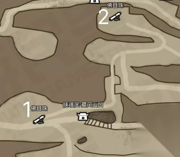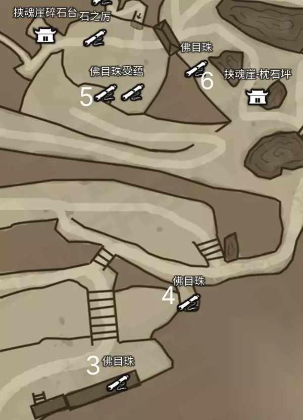 石敢当召唤出来就会和石先锋PK,这个时候当然是石敢当更胜一筹,他被打到半血左右会直接秒杀石先锋,然后我们的BOSS就是石敢当啦! 这个时候我们要打的就是石敢当 在他侧面或者背面的时候,要注意,他会从侧面或者背面砸下来 在正面的时候也要注意,他也会有范围的AOE技能,只不过范围是正面扇形区域 他也会从远距离飞扑过来,然后用他的身体来压你,这个也很好躲避 输出方式也是差不多的,抓技能空挡打输出 佛木珠位置 首先是地图,我在地图上标记了序号对应下面的图: