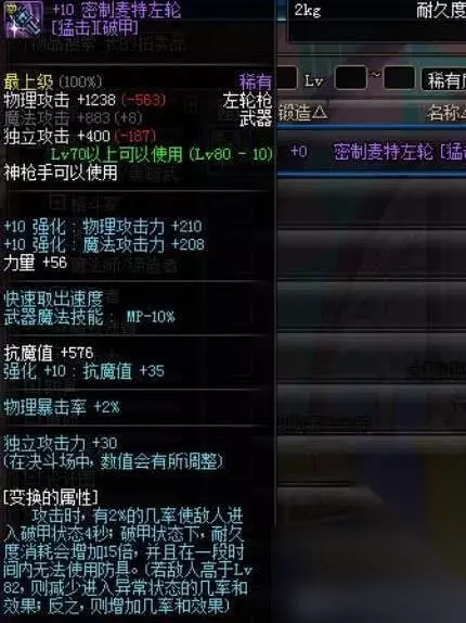 26%的黄字属性,则意味着这件装备在没有黄字的情况下,能够直接提升26%的伤害加成,单论伤害加成,这件装备的属性已经超越普雷右槽了。再加上另外一个破武器属性,能直接让敌人武器失效,等于给佩戴者8秒无敌时间,无敌BUFF几乎BT到堪比神话SS。
