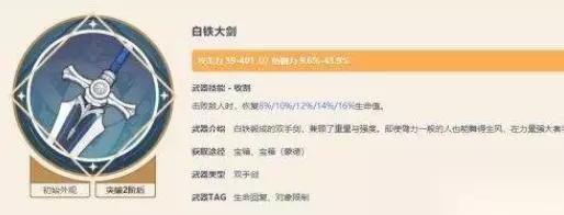 3、白铁大剑(白影下位)、 如果你原坯已经用完了,那么就选择白铁大剑吧,只要你在大世界开开箱子就能获得它,获取难度无限接近零,虽然三星武器基础面板低,但附属词条防御力加成只比白影剑低7.8%(不算白影剑技能),而女仆对基础面板要求不大,而且单论辅助能力的话,它绝对远超过其他其他大多数武器。
