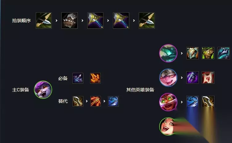 装备分析 小炮必备轻语,第二件无尽/杀人剑、巨杀都行,第三件羊刀/飓风/饮血,怕控制也可以做水银。 前排金龙推荐狂徒+石像鬼板甲,有其它肉装仍上去就好。青龙刀金克斯三星就给金克斯,露露三星就给露露,有多余的物理输出装就给飞机,两星飞机也能打出很高的伤害。其它多余的装备攻速旗伏击可以给露露提升小炮的输出。