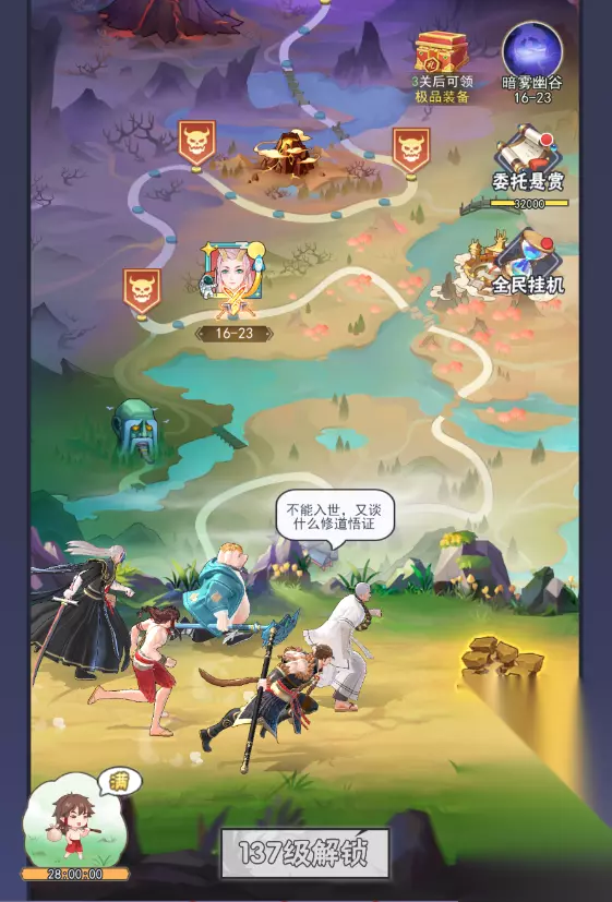 【闯关】 闯关可以切出战斗,善用切出功能边收菜边强化进阶边推图,效率拉满 【快速挂机】 快速挂机得到的经验值跟闯关的进度有关,尽量打到卡等级再使用快速挂机,最大化挂机收益 【浮屠高塔】 浮屠卡关时不用急,可以先试着调换站位,让自己的输出多存活一轮,或者先打掉对位的重要角色,或者单纯赌对方miss或者不暴击,有可能很容易就过去了。 VIP6可以自动闯关,剧情副本和浮屠直接自动就过了。不到VIP6也没关系,达到50级也可以解锁,一周内基本就到了。 【西行秘闻】 产出魂录的主要途径,魂录和拍卖获得的真火可以提升主角品质,前期尽量顶满。 【寻经】 产出经文的主要途径,前期尽量推层,推到可以获得橙色品质经文,这时就可以根据自己阵容的需要刷对应经文了。