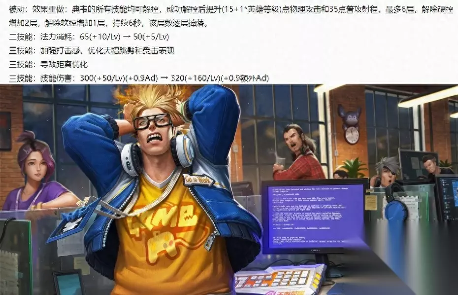 典韦加强:被动改为三个技能都可以解控,解控后获得攻击和射程,2技能的蓝耗降低,全肉典韦的大招伤害降低,半肉典韦的大招伤害增加。