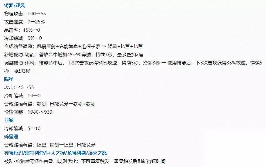 逐风加强:暴击装改为攻速装,被动新增大量物理穿透。 碎星锤合成路径中的铁剑改为迅捷长矛。 黄刀和肉刀加强:被动可以重置持续时间。