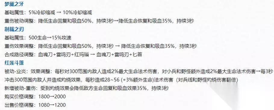 3、12件装备调整 梦魇之牙削弱:冷缩增加,重伤效果降低。 制裁之刃削弱:血量改为攻速,重伤效果降低。 红莲斗篷加强:新增重伤效果,被动每三秒灼烧一次持续伤害。