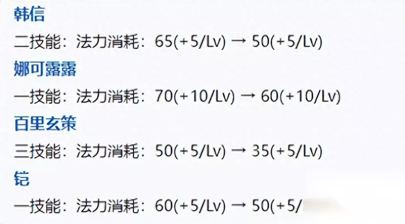 铠、韩信、娜可露露、百里玄策的蓝耗降低。