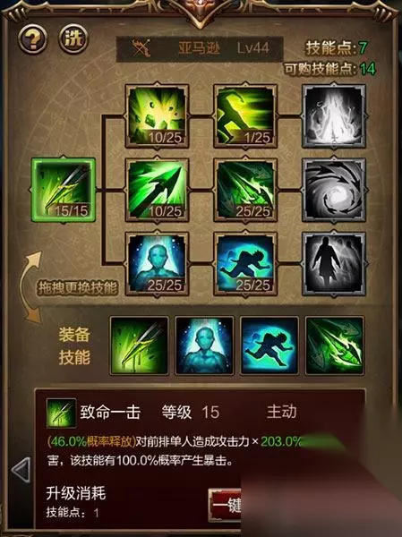 亚马逊的天赋技能【致命一击】则是通关副本的绝技了,释放技能时双倍的攻击加成,100%概率产生暴击更是给堆暴击伤害的玩家满额的惊喜,在前期触发这个技能基本是可以秒杀对手了。 说到暴击,亚马逊的二阶技能树又带给玩家一个十分血腥的技能【内视】,直接提升了亚马逊的暴击率,在装备堆满物理伤害和暴击伤害加成的情况下,选择这个技能可以说收益非常的巨大了。