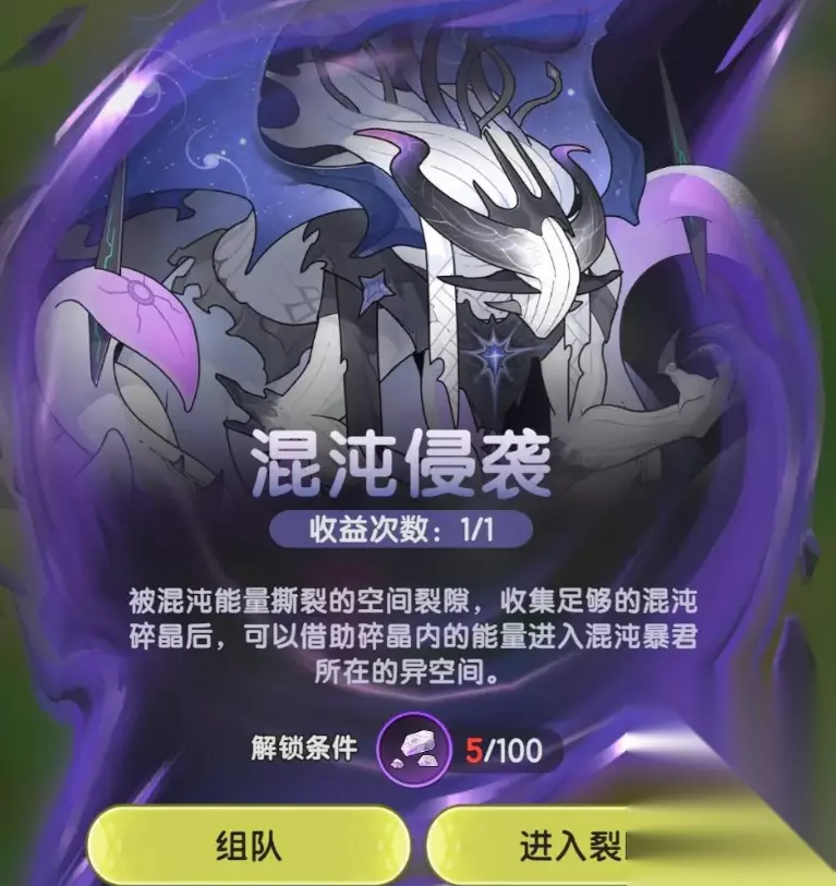 当大家成功收集100枚后,就可以进入挑战阶段,这时可以通过地图上的混沌狭缝传送到异空间中,挑战混沌暴君,挑战过程中可和其他同样收集齐的玩家一起组队,首次挑战成功和总计伤害量,会帮助获得一定量的混沌晶块作为奖励,后续大家可以用混沌碎晶和晶块,在家园的神秘商人那兑换多种道具。