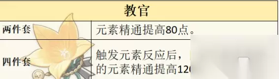 2、教官 两件套:元素精通提高80点。 四件套:触发元素反应后,队伍中所有角色的元素精通提高120点,持续8秒。