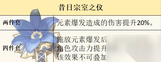 二、圣遗物推荐 1、昔日宗室之仪 两件套:元素爆发造成的伤害提升20%。 四件套:施放元素爆发后,队伍中所有角色攻击力提升20%,持续12秒,该效果不可叠加。
