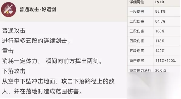一、技能介绍 1、普通攻击.好运剑 进行五段的连续剑击,重击是会消耗体力,瞬间释放出来两剑,在空中下坠造成范围伤害。