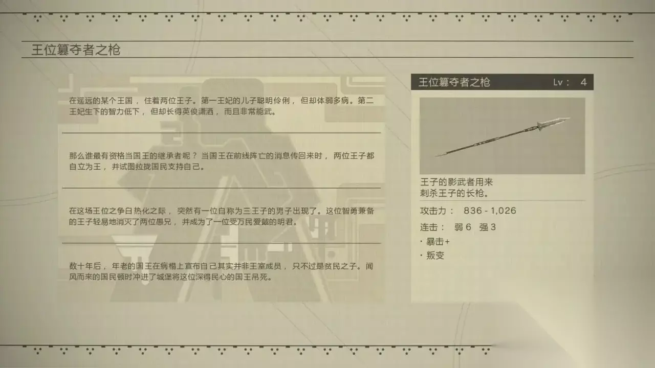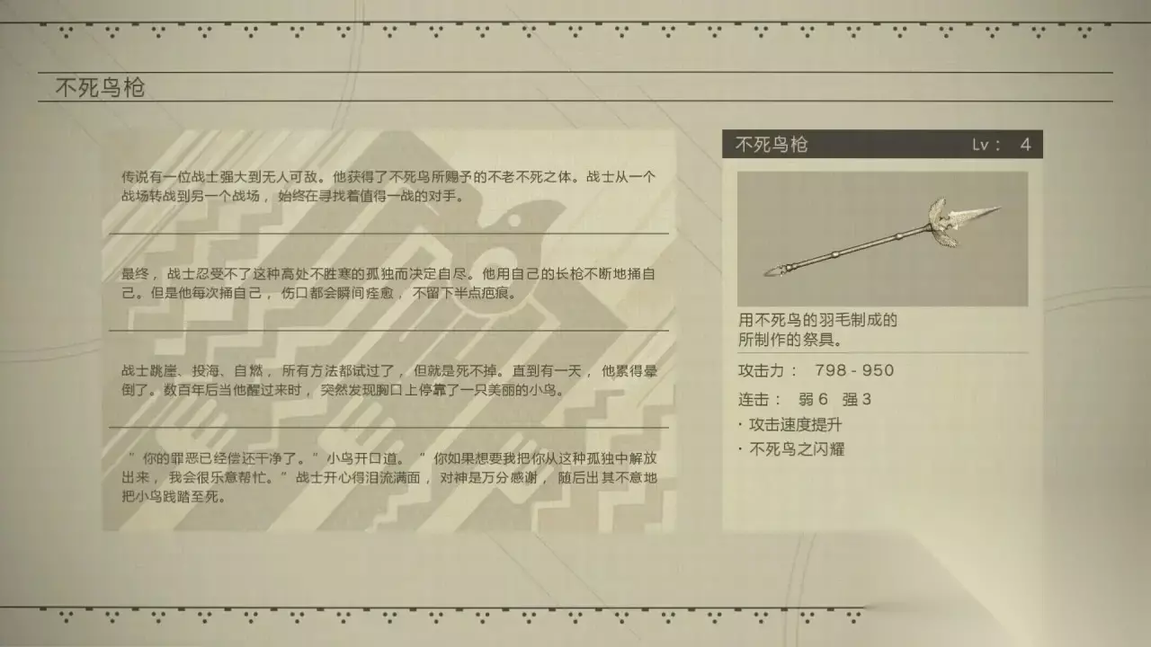 《尼尔机械纪元》长枪全收集第一期攻略分享 不死鸟枪 技能特殊效果:不死鸟之闪耀(对敌人造成伤害,可以回复自身血量)