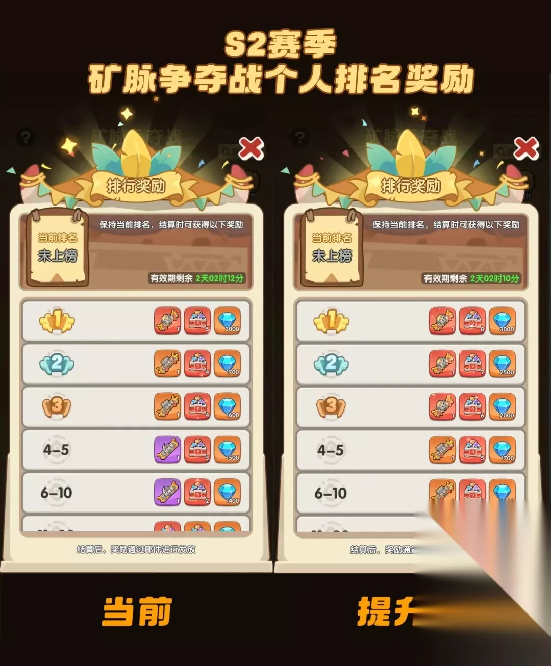<矿脉争夺战个人周榜奖励调整示意图> 同时,由于10月21日进入S2赛季的1-86服的勇者已进行竞技场&矿脉争夺战首周榜单奖励与竞技场战令结算,为了确保所有勇者都能获取到提升后的奖励,我们将对此区间区服的勇者,补发首周竞技场&矿脉争夺战周榜对应提升奖励后的差额,以及竞技场战令差额。请此区间的勇者们在榜单奖励更新后,记得查看游戏内邮件领取补发奖励。 <以上内容预计于11月2日更新,具体请以游戏内更新时间为准> 2、S2赛季FAQ Q1:什么时候推出S2赛季玩法? A:赛季玩法在10月21日开发完成并上线。 Q2:新赛季开启条件是什么,怎样才能进入S2赛季? A:您所在区服开服时间24天以上,将进入S2赛季等待队列,在赛季机制重组区服后,您所在区服将进入S2新赛季。 Q3:哪些区服会合到一起? A:新赛季合服将根据区服开服先后顺序和各区服活跃情况,采取就近区服合服策略,提高合并区服活跃和体验。 Q4:为什么有些区服进入S2赛季时合服数量那么多? A:由于赛季系统上线时部分区服开服时间远超24天,且当前活跃人数较低,为提高新赛季区服活跃给大家带来更好的游戏体验,因此提升了部分老区服合服范围。 Q5:合服后可获得的资源不变,战力提升较慢,竞争压力变大了。 A:我们有关注到这个情况,所以本次为大家提升了竞技场&矿脉的奖励,同时也陆续调优新赛季的各个玩法奖励产出,让大家能够在多个玩法里,哪怕拿到的名次明显低于上个赛季,所获得的奖励也会尽可能优于旧赛季。