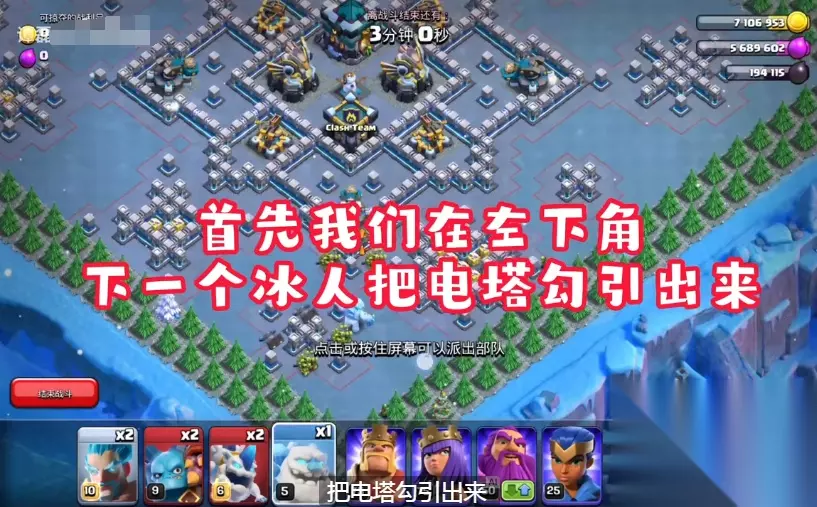 5、接下来什么都不要动,等它们把城堡打掉吧! 6、在右下角下一个冰人和双王,这个时候你会看到出来一个电塔 ; 7、接下来放出闰土让他去找猹,只要前面把城堡打掉,现在基本上就已经三星了。 8,剩下的东西随机应变就可以了,大本激活后,永王大招保可以爆本的哦。 这次的挑战就聊到这里了,新手clash圣诞节挑战打法奖励是不是很好拿呢,不懂的小伙们多看几遍吧!