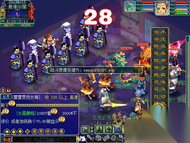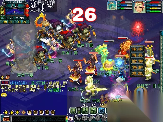 提示:怪多为PS DT LG HS TG等,高攻高秒,双抗,会炸蓝吸蓝;建议先封PS LG,杀DT;在每场战斗结束当前回合将鼠标放在人物气血或魔法条上点右键即可加满血或蓝(道具栏里有合适的药的情况下)。