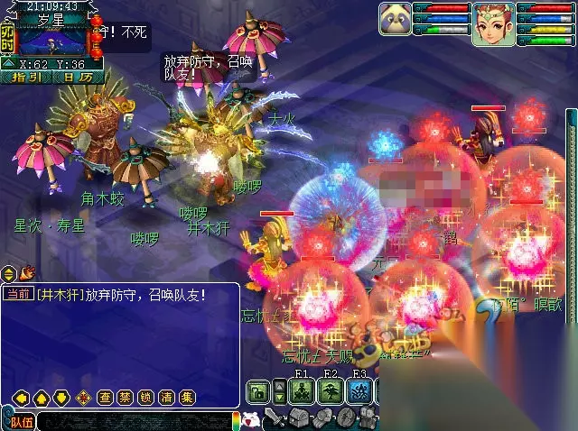 提示:不杀主,一定回合后队长召唤出元辰,小怪死光后元辰日月乾坤封印主。主一直用乾坤斩,不会被封不会中毒。建议按顺序集火。注意,即使是被日月乾坤封印的小怪也是要杀的。 第三层(荧惑)—— 灭火啦灭火啦,小火中火可以直接扑灭但是会损失一定气血,大火需找龙超取水~也可以全队出去等待片刻之后回来暴力破坏机关核心(同第一层)。