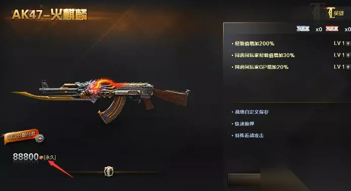 枪械数据: 枪重:4.30kg 全长:870mm 弹匣容量:35/105 有效射程:300m 射速:600RPM 上手度:五星 热门度:五星 额外属性: 1、经验值增加200% 2、战绩自定义保存 3、同房间玩家经验增加30%(包括自己) 4、同房间玩家GP增加20%(包括自己) 5、创建房间特殊“V”标示 3、武器特点 换弹快(1.8秒)、切换快(1.5秒)、大量后备弹夹(35:105)、稀有特效外观(眼睛炫酷红色火焰)、刺刀穿刺速度快。 其他英雄级武器价格一览: cf英雄级武器价格表 1、火麒麟 88800CF点,人民币888元,最早的英雄级武器,英雄级武器里当之无愧的老大哥。