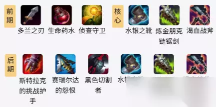 lols11剑姬出装推荐 小编推荐: 一、上单常用出装 1.初始装备:多兰之刃+生命药水+侦查守卫 2.核心装备:水银之靴+炼金朋克的链锯剑+渴血战斧 3.后期装备:斯特拉克的挑战护手+赛瑞尔达的怨恨+黑色切割者+水银之靴+炼金朋克的链锯剑+渴血战斧(神话)