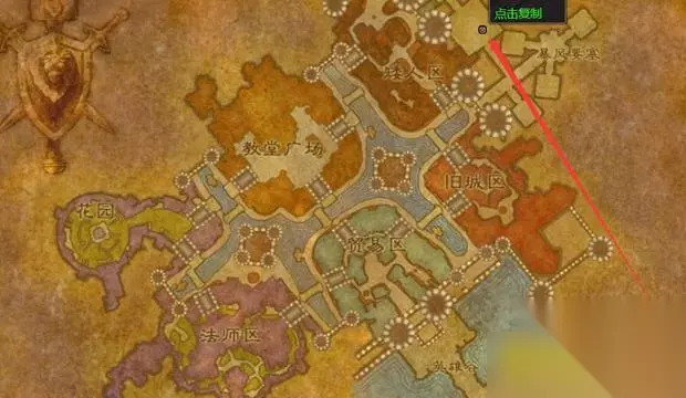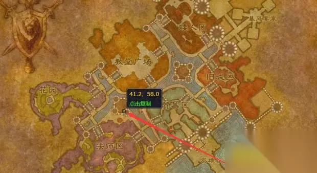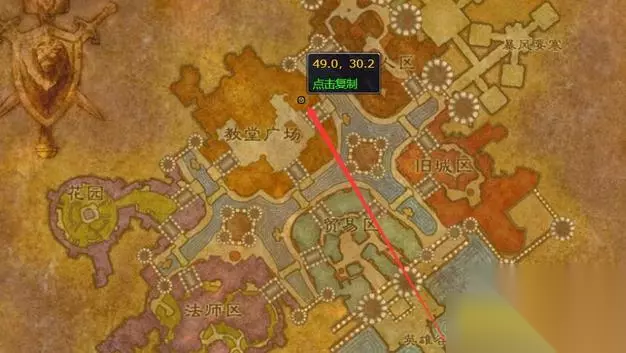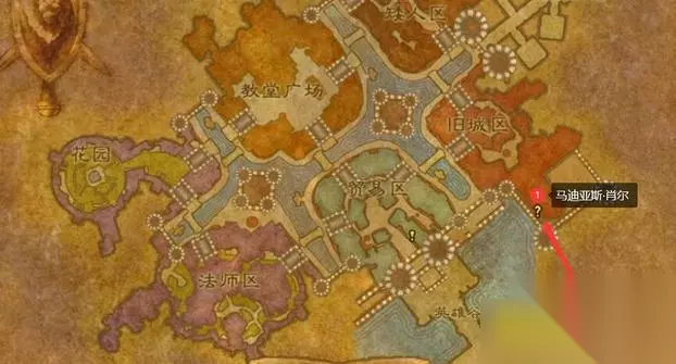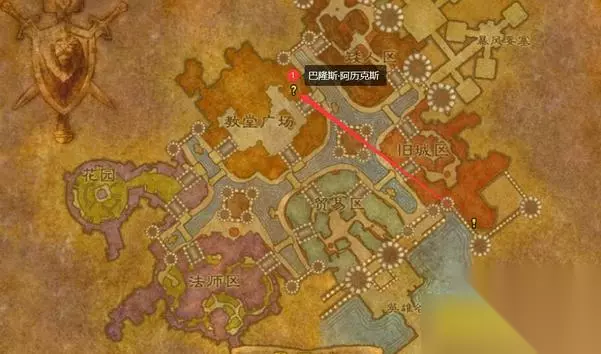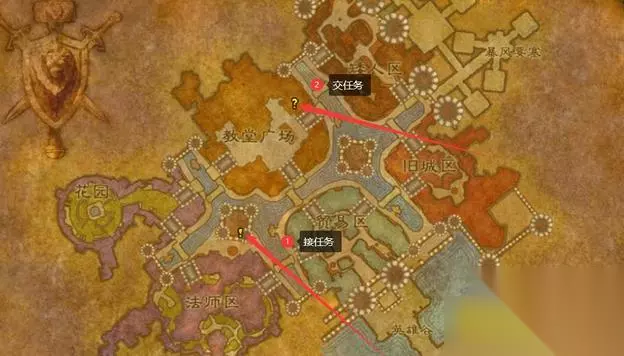 9.伏击! 在泰里恩处接取任务,等待葛瑞格·莱斯科瓦公爵和沉默之刃马尔松在花园里的对话结束,杀死他们两个,之后向暴风城的提亚斯回报。 红线是任务目标的移动路径