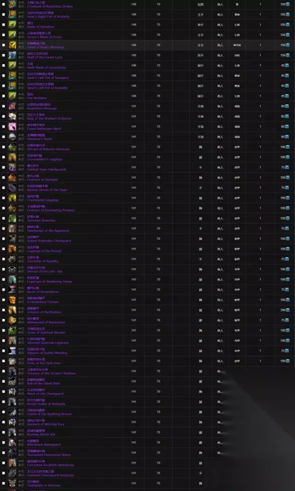 二、141级装备 安格莉丝塔的复仇 坚定卫士指环 虚空精华指环 安薇娜的触摸 自然和谐外衣 巡林者护腿 橡叶护手 星光之拥 先知的荆棘手套 晶风护腿 永恒勇武护胸 桀骜长裤 侵掠手套 龙皮鳞甲 追击护腿 迅急手套 罗雷尼尔长袍 炽焰护腿 魔咒长靴 神职者的胸甲 镇静腿甲 弥补腰带 灵魂奇迹法衣 天神纹饰护腿 忠诚治愈之鞋 黑暗时刻外套 占星者侍从长裤 寂静路途腰带 生命波浪胸甲 符文古鳞护腿 抚慰轻风腰带 涡流之怒外套 疾速风暴褶裙 余震腰带 苫痛魔魂长袍 腐蚀魂织长裤 末日卫士的灵魂之握 淡泊胸铠 太阳卫士腿铠 无畏者腰带 愤恨胸铠 无尽怒火腿铠 沸腾怒气护腰 沙塔斯护卫胸铠 奥尔多铭文腿铠 正义卫士胫甲