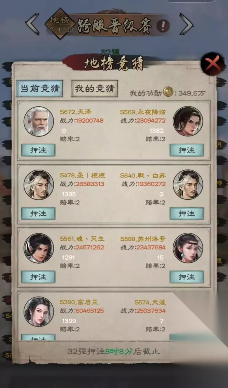 二、武林大会押注注意事项 武林大会作为一项广受少主们喜爱的活动,其押注环节功不可没。通过押注于心仪选手,少主们得以有机会获取丰厚的功勋奖励。然而,经过与众多少主的交流,我发现有相当一部分少主在押注环节上遗憾地错过了许多获取功勋的机会。甚至有些少主连一本九阳神功都难以购买。为了让少主们更好地把握每一个机会,我想向大家介绍一下如何充分利用押注环节来获得全部的功勋。 武林大会在每周五开始,并在周六进行首轮筛选,选出32强选手。而周日晚8点,最激动人心的比赛将正式开始。 在32强选手诞生之前,少主们就有机会进行押注。但请注意,押注并非仅限于页面上显示的单一界面,通过左划和右划操作,少主们同样可以进行押注。天、地、人三榜单都是可供押注的选项。 而且,押注的机会并不只存在于32进16的阶段。从16进8、8进4、4进2到最后的1对1决赛,每个阶段都有押注的机会。这也就意味着,在每个阶段的准备阶段都可以进行押注操作,赢取功勋。 回想起曾经的自己,我深知也错过了许多押注的机会。因此,我十分理解少主们的感受。希望通过以上的介绍,少主们能够在武林大会中更加明智地把握押注机会,从而获得更多的功勋奖励。
