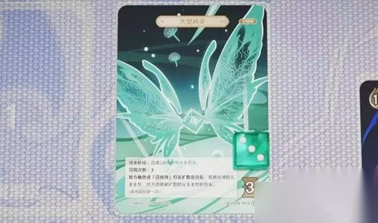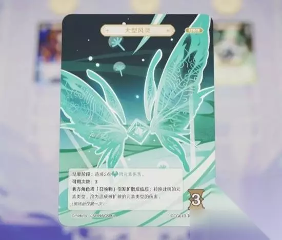 由于先宣布结束,对方依然为先手玩家,对方战斗行动后轮到我方行动,我方选择打出手牌行动支付一个元素骰打出事件牌。白垩之术。根据卡牌效果,将迪卢克的一点出能转移给出战角色砂糖,我方继续行动,选择使用技能行动支付三个风元素骰与两点充能,使用砂糖发动元素爆发,砂糖将对对方出战角色造成一点风元素伤害,并召唤大型风灵,将配件牌大型风灵找出后放在召唤物区。由于大型风灵可用次数为三,所以放置一个点数为三的骰子作为标记。
