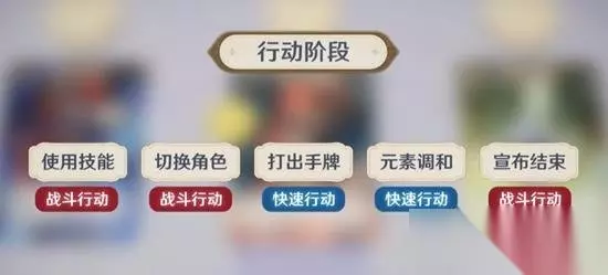 行动阶段 从先手玩家开始,双方轮流进行行动,行动分为战斗行动与快速行动,进行过战斗行动后会抡到对方玩家行动。可以进行的行动有以下五个,使用技能、切换角色、打出手牌、打元素调和以及宣布结束。双方都宣布结束后进入结束阶段,先宣布结束的玩家成为先手玩家,结算完效果并抓牌后开始新的回合实战演示对局开始投掷阶段,双方投掷八个元素骰,并能将任意数量个骰子重投一次。