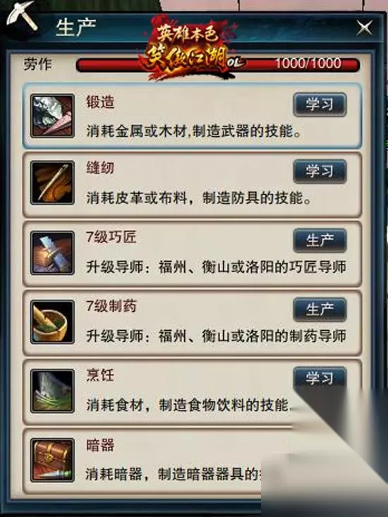“生产”界面 再来说说这里面非常重要的“劳作”值,生产的过程中会消耗你的劳作值和银两,劳作值你便可以理解为体力,额定分配给角色的劳作值为1000,消耗完之后,可以通过服用“滋补丹”来恢复。 接下来就要来说说这各项目的生产道具和具体的生产步骤。 生产道具实际上就是生产工作台,比如说制药就需要药鼎,做食物就要烹饪灶台,做武器就要工匠台(打开洛阳地图,在右下方分布紫色圆圈“药”“匠”“烹”“缝”“锻”)。