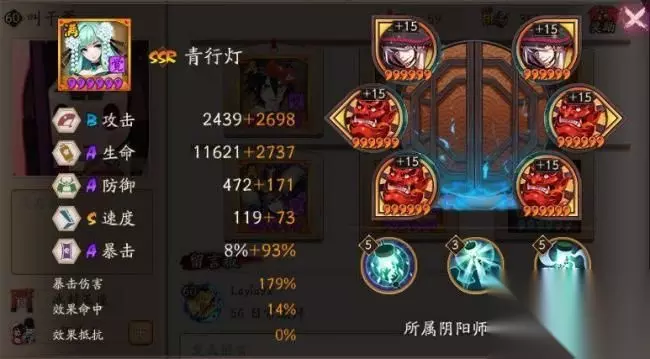 2)反击灯 反击灯的思路和现下非常流行的吸血姬类似,不同的是,吸血姬是造成大量伤害,而青行灯反击则是吸取鬼火。敌方一个群过来,费了3火,又被吸走2火,怎么想都非常憋屈吧,直接打乱了节奏。 反击灯带狰御魂,速度没有要求,但是要够肉。 2号位攻击,4号位生命,6号位暴击。 3)破势灯 破势这个御魂大家非常熟悉,茨木、白狼、小黑都是破势的狂热追求者。青行灯也不例外,破势灯可以开局压血,本身3火技能的面板伤害就很高,158%加上升级之后,接近190%的伤害,算上破势的40%的伤害,技能伤害就已经非常可怕了。 破势灯有两种类型,一种是速度破势,不需要过分依赖拉条,另一种是攻击破势,2号位选择攻击,依靠双拉条来出手,伤害较高。 2号位速度(攻击),4号位攻击,6号位暴击。 4)爆伤灯 爆伤灯有不少人一直眼馋,但是的的确确非常难养,6号位要求爆伤,暴击就非常难堆,其他御魂的副属性需要大量的暴击来撑起数值,不然爆伤再高,没有暴击,非常尴尬。 爆伤灯没有固定的御魂选择,但是破势是首选,网切也是可以的。心眼收割灯比较少见,在这里不多说。 2号位攻击(速度),4号位攻击,6号位爆伤,其他御魂副属性高暴击。
