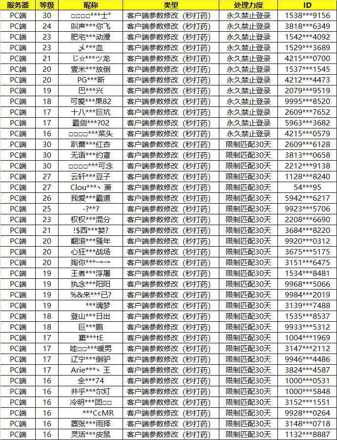 以下是近期开挂玩家,我们加大力处罚
