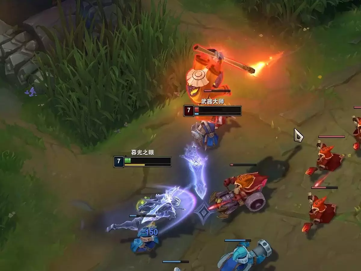 武器大师在对线期其实主要玩的是兵线理解。线权对武器大师来说非常重要,武器大师一个非常经典的打法,就是利用E技能推线,能连人带兵一起晕,不能的话也尽量打到更多的兵,来保障自身可以抢二。随后对手稳健就换推线回家补给,对手给机会则可以尝试单杀。