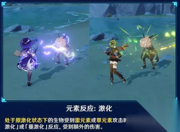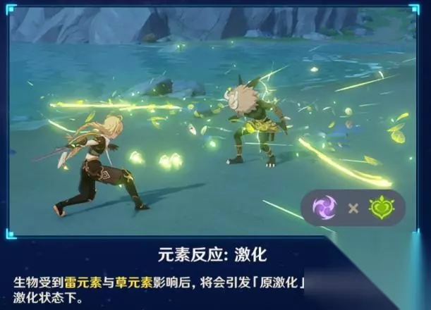 90角色1000精通时,超载反应伤害大约27000,感电伤害大约16000/每跳。对比来看,激化反应基础伤害偏低,但好在吃增伤和双暴。虽然一个角色一个附着频率,但正常来说, 结论1:增伤/双暴区间薄弱的角色打激化反应收益有限。 可能对他/她自己来说提升不少,但人比人就算了。 结论2:纯堆精通不如去打剧变反应。 关键点:300精通 300精通时,激化的增伤翻倍。这同时也是一个坎,可以简单认为,300精通以后,精通的收益率会大幅下降。 以超激化来说,300精通时,伤害翻一倍,为3328;而800精通时,伤害才翻两倍,为4992。 三、激化反应的特点和性质 这方面它和冻结反应很像。对,你没看错,和冻结很像。 0、草不和冰风岩反应。 1、 触发,无论先挂草还是后挂草,无论先挂雷还是后挂雷,都可以触发“原激化”,并使怪物在一定时间内处于原激化状态下。 就像无论先挂水还是先挂冰,都可以触发“冻结”,并使怪物在一段时间内处于冻结状态下。 2、 我们知道冻结状态,其实是一段时间的“冻”元素附着。原激化状态也是一样的,我们给它暂且命名为“激”元素附着。 (冻元素和冰元素的符号,肉眼看上去尚有些许差别,草元素和激元素的符号,那真是一毛一样。要不是前有冻结反应为参考,我一时半会还真弄不懂这个激元素) 3、 激元素,可以像草一样参与反应。比如激元素遇水会“蔓生”,掉落草种子,然后激元素被消耗,后续无法再超激化或蔓激化。 就像冻元素,可以打融化,然后解除冻结。 4、 触发“原激化”时,后手元素不残留,先手元素有剩余会残留。和冻结一样。这同样也是一条反应的基本原则。可以用北斗和草系一试便知。 5、 激附着下,触发“超激化”,雷元素并不会被消耗;同样的,蔓激化也不会消耗草。 就像冻元素下可以藏冰藏水,激元素下也可以附雷附草。 雷比较明显,有自己的符号显示。草和激共用一个符号,看不出来但可以试出来。 6、 激状态下,再次挂雷挂草,可以施加新的原激化。 就像冻结状态下,再次挂水挂冰,可以施加新的冻结一样。 7、 和冻结时长一样,原激化时长,由附着量低的那个元素决定。但是这一条不太重要不用记。 没有其他干扰的话,大致是这个公式:即弱激是10秒,强激是14秒,超强激是22秒。