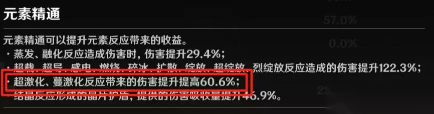 原激化是给怪施加一种负面状态。怪在这种负面状态下,被“雷附着”或“草附着”,会有额外伤害。 原激化+雷附着=超激化。 原激化+草附着=蔓激化。 注1:先有附着才会有反应,这个原则依旧生效。不能附着的雷伤或草伤,不能反应,只有原本的伤害。 注2:超激化和蔓激化,不会消除原激化。原激化不是一次性的。 二、激化伤害 激化反应有一个基础伤害,超激化是1664,蔓激化是1809。(可能有个位数的误差) 只计算90级角色,研究其他等级没有意义,当你圣遗物三五天提不了10暴伤的时候,就应该把角色拉到90级了。 角色面板里,精通的提升,就是提的这个基础伤害。 如图,超激化的额外伤害=1664×(1+60.6%),蔓激化的额外伤害=1809×(1+精通收益)。