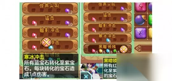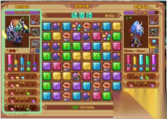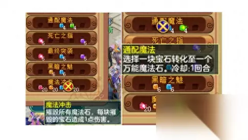 法师最需要的是蓝色和绿色的积累,然后再是红色和紫色。所以在一开始,法师就需要消除蓝色和绿色来达到对技能通配魔法的使用,利用通配魔法的万能魔法石来达到4连增加额外回合。这样的法师在连招上是可以获得很多次额外回合,从而实现颜色方块的各种积累,最终打败对手。