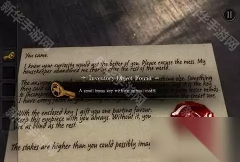 第一章攻略 1、双击信封,拿出信件,印章处有一把钥匙