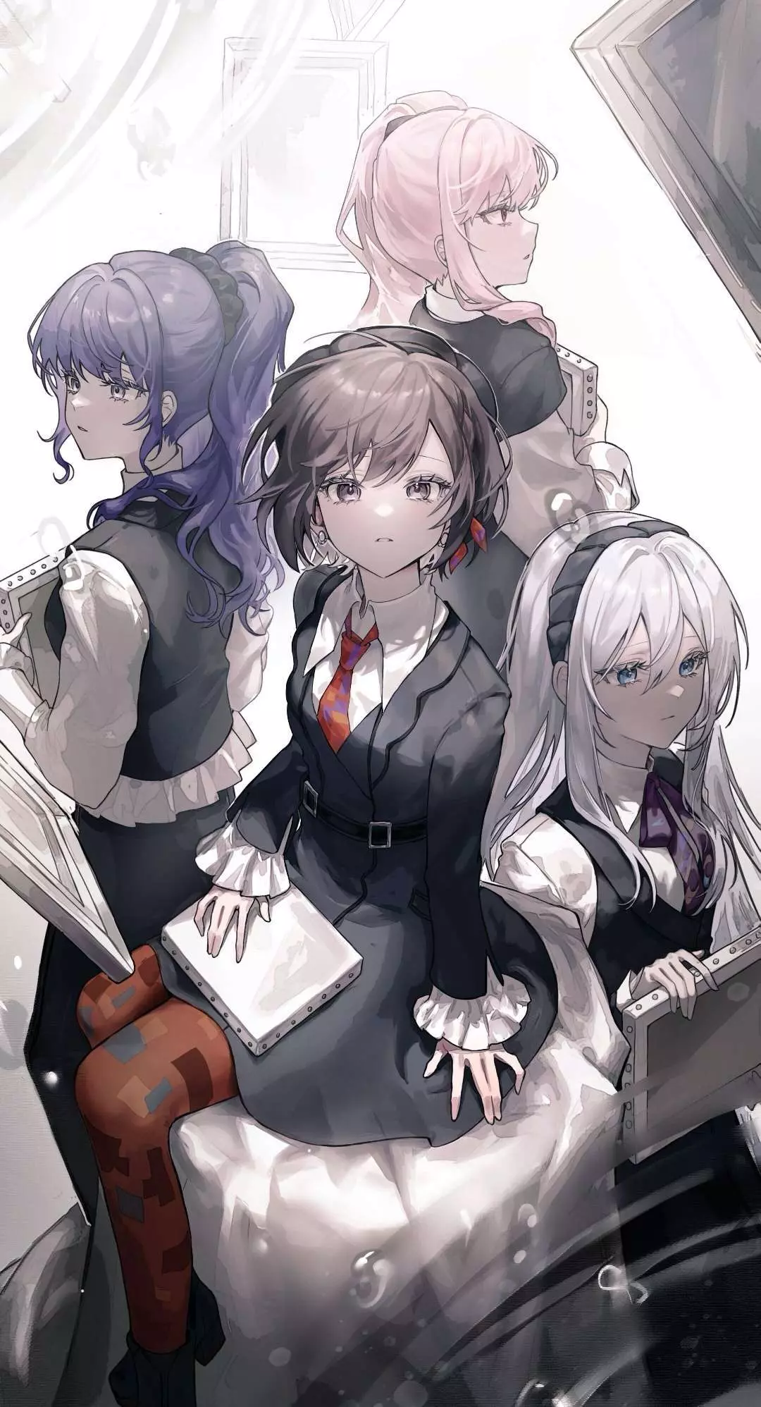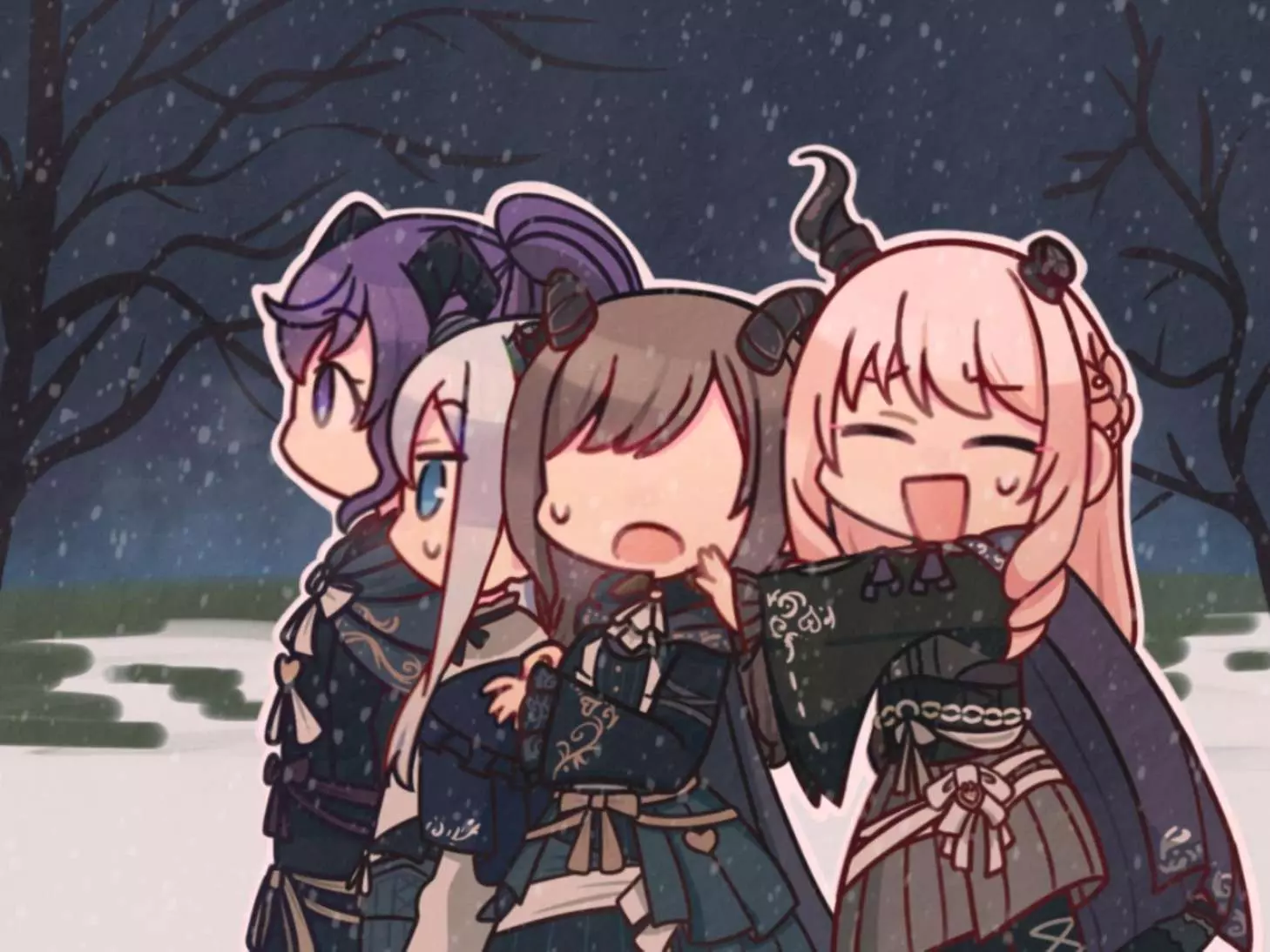 宵崎奏(蓝色)东云绘名(棕色)朝比奈真冬(紫色)晓山瑞希(粉色)
