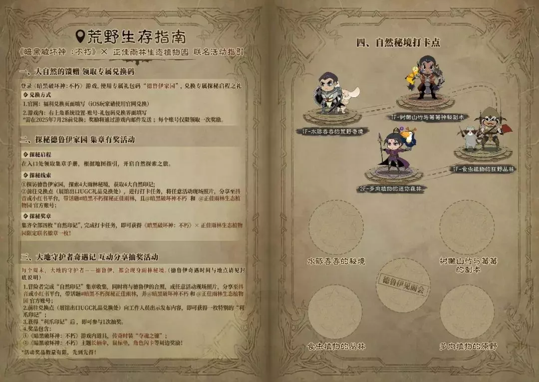 集齐4枚印章后,大小冒险者即可在雨林荒野中自由探寻自然奥秘。只需要在离开前,于兑换点完成社媒打卡任务(兑换点设于展馆出口UGC礼品兑换处),就可获得一枚暗黑不朽×正佳雨林生态植物园的限定联名徽章!