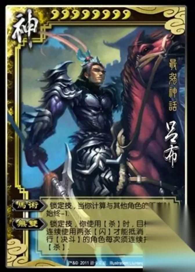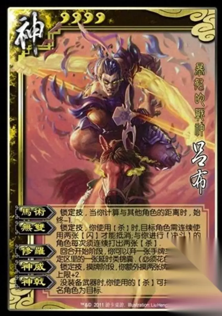 这时候,官方给出的封号是:暴怒的战神! 马术和无双还是一样,但是增加了修罗、神威和神戟。 修罗:回合开始阶段,你可以弃一张手牌来弃置你判定去里的一张延时锦囊牌(必须花色相同) 神威:锁定技,摸牌阶段,你额外摸两张牌,你的手牌上限+2 神戟:没装备武器时,你使用的杀可指定至多三名角色为目标 不是,这修罗怎么看着这么眼熟啊,这不就是三国杀移动版斗地主模式地主的技能跋扈吗?当然,跋扈要比这个更强一点,不需要花色相同也可以发动。 这个神威,像是地主的技能飞扬,但是很明显,这可比飞扬强多了。飞扬只能摸一张牌,而且还不能增加手牌上限。