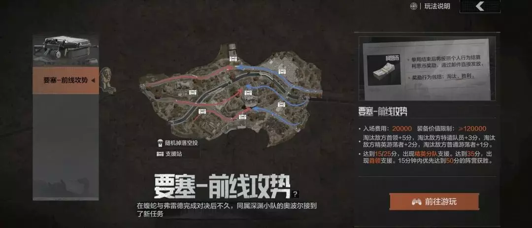 活动期间,地图界面限时开放【要塞-前线攻势】入口,先锋们需要带入装备价值大于12万柯恩币,且支付入场费2万柯恩币。可以选择加入深渊小队或卡莫纳卫士团加入战斗!