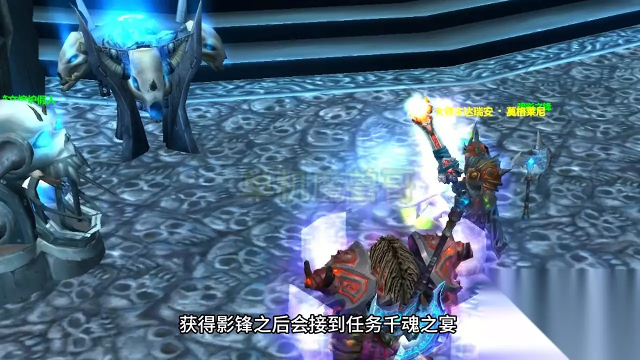 获得四种物品后,回到冰冠堡垒,交给莫格莱尼,他会为你铸造一把影锋,一把264等级的紫色双手斧,这也是一把非常实用的武器。然而,大部分玩家会止步于此,因为接下来的任务更加困难。 获得影锋后,你会接到千魂之宴任务。任务要求你用影锋杀死冰冠堡垒中的1000个巫妖王的爪牙,只有装备上影锋并杀死冰冠堡垒中可以获得声望的怪物才算数。