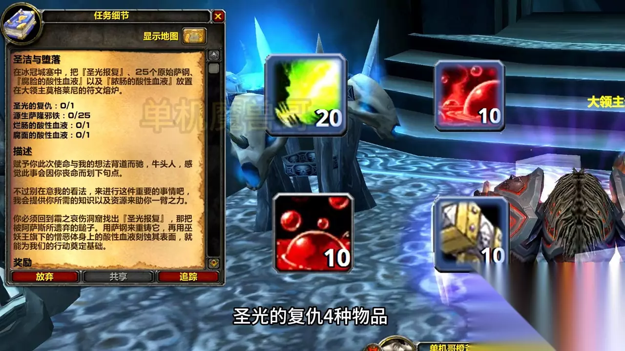 →最后,你需要圣光的复仇。这是在龙骨荒野的霜之哀伤洞穴获得的,没有难度。在这里,你会遇到巫妖王,但不必担心,这只是一个剧情任务。