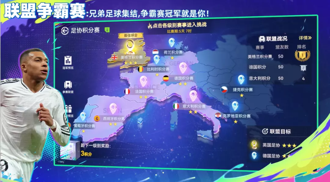 2.足协赛事:联盟成员可以进入任意地区积分赛参与赛事,击败其他联盟对手获得协会积分。对应地区足协积分最高的联盟可以获得该地区冠军联盟。