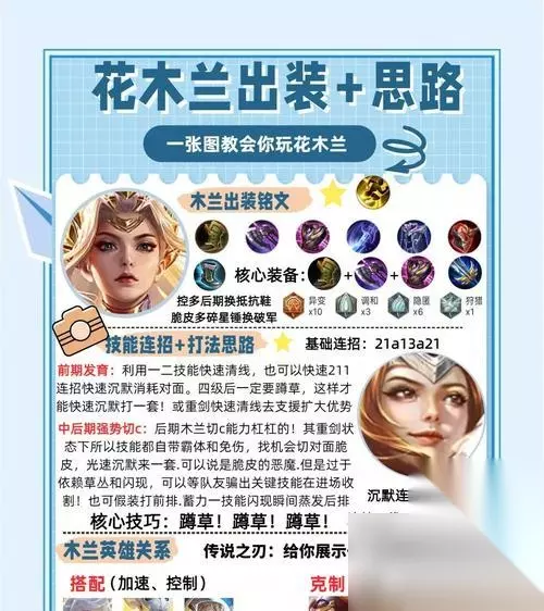 本文目录一览 1、王者荣耀花木兰攻略 作为王者荣耀中最具代表性的女性英雄之一,花木兰无疑是无数玩家钟爱的英雄。今天我们就来一起探讨一下如何正确地使用花木兰的技能和出装铭文搭配,以及如何运用连招将花木兰打造成为一名不可战胜的英雄!