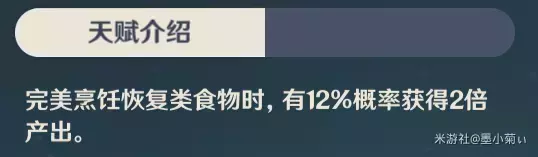 分析: 还在为制作甜甜花酿鸡而猎杀蒙德门口的鸽子吗?有了这个天赋!就有几率省下2个禽肉哦!(好像也不是很多),聊胜于无的小天赋。